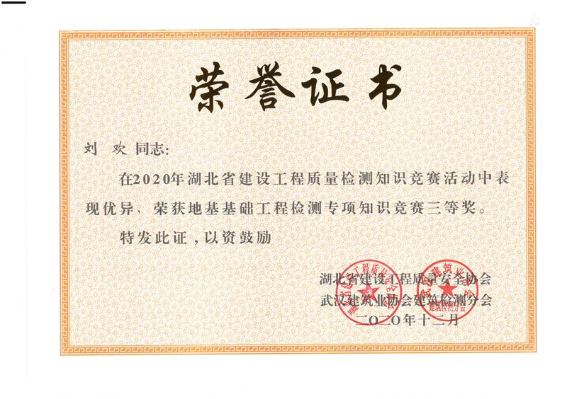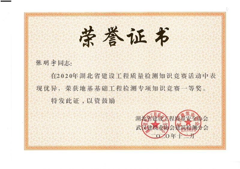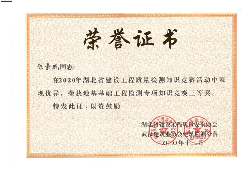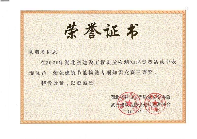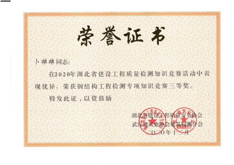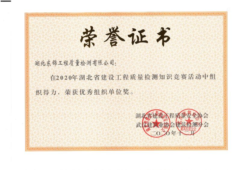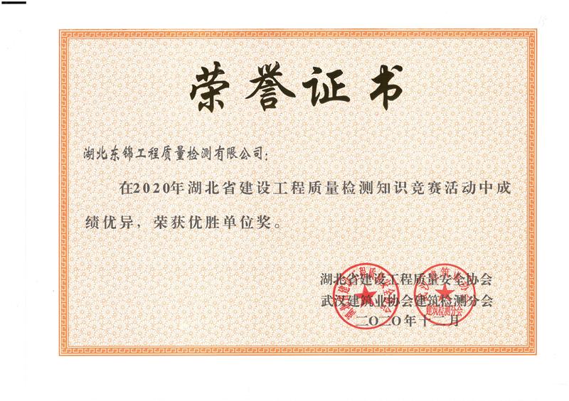 閱讀次數(shù):1324 發(fā)布時間:2021年01月08日為提升工程質(zhì)量檢測行業(yè)整體學(xué)習(xí)氛圍,提高檢測從業(yè)人員專業(yè)技能水平,弘揚檢測人員愛崗敬業(yè)精神。近期,省質(zhì)安協(xié)會和武漢建筑業(yè)協(xié)會建筑檢測分會采用線上統(tǒng)一平臺答題方式聯(lián)合開展了檢測知識競賽活動,公司積極參與此次競賽,并取得“優(yōu)勝單位獎”和“優(yōu)秀組織單位獎”。在此次比賽中,參加競賽人數(shù)中,武漢市2283人,宜昌市503人,襄陽市593人,荊州市189人,十堰市224人,黃石市144人,黃岡市133人,荊門市138人,咸寧市113人,恩施州255人,仙桃市87人,鄂州市61人,孝感市134人,隨州市75人,天門市25人,潛江市71人,神農(nóng)架林區(qū)23人。 各專項競賽人次分別為:地基基礎(chǔ)工程檢測專項1202人,主體結(jié)構(gòu)及設(shè)備安裝工程檢測專項1410人,鋼結(jié)構(gòu)工程檢測專項392人,建筑節(jié)能檢測專項577人,室內(nèi)環(huán)境檢測專項587人,建筑幕墻檢測專項48人,見證取樣檢測專項2213人,累計考試人次為:6429人次。俗話說“一分耕耘一分收獲”“時間在哪里。結(jié)果就在哪里”,公司部分員工憑借著扎實的專業(yè)知識,在比賽中也取得了相應(yīng)的成績。