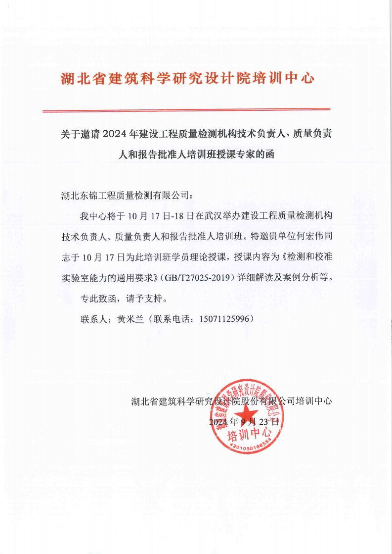閱讀次數(shù):897 發(fā)布時間:2024年09月27日2024年9月23日,湖北省建筑科學研究設(shè)計院股份有限公司培訓中心發(fā)函邀請公司總經(jīng)理何宏偉于10月17日-18日在武漢舉辦的建設(shè)工程質(zhì)量檢測機構(gòu)技術(shù)負責人、質(zhì)量負責人和報告批準人培訓班上授課。授課內(nèi)容為《檢測和校準實驗室能力的通用要求》詳細解讀及案例分析。