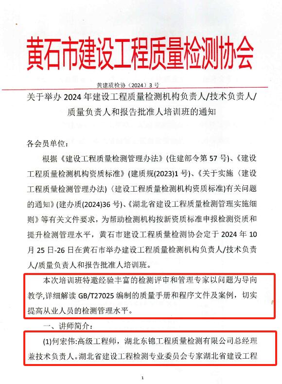 本次培訓,是黃石市建設工程質(zhì)量檢測協(xié)會主辦,旨在提高從業(yè)人員的檢測管理水平。