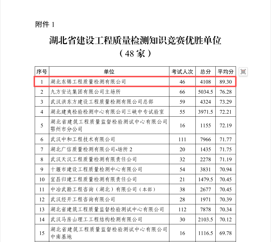 近日,從湖北省建設(shè)工程質(zhì)量安全協(xié)會(huì)傳來(lái)喜訊:在剛剛落幕的2025年湖北省建設(shè)工程質(zhì)量檢測(cè)知識(shí)競(jìng)賽中,我公司憑借扎實(shí)的專(zhuān)業(yè)功底、出色的現(xiàn)場(chǎng)發(fā)揮和卓越的團(tuán)隊(duì)協(xié)作,從眾多參賽隊(duì)伍中脫穎而出,榮獲大賽最高榮譽(yù)——“優(yōu)勝單位”稱(chēng)號(hào)。這一殊榮充分彰顯了公司在建設(shè)工程質(zhì)量檢測(cè)領(lǐng)域的深厚技術(shù)積淀與人才優(yōu)勢(shì)。