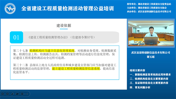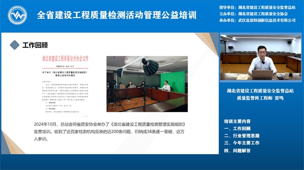 5月29日下午2:30,線上公益培訓開始,武漢富思特創(chuàng)新信息技術(shù)有限公司總經(jīng)理謝玉超對新版湖北省建設(shè)工程質(zhì)量檢測監(jiān)管系統(tǒng)功能進行詳細介紹,新版湖北省建設(shè)工程質(zhì)量檢測監(jiān)管系統(tǒng)運用數(shù)字化手段和AI技術(shù),實現(xiàn)對檢測資質(zhì)和檢測活動的動態(tài)化、精準化監(jiān)管,構(gòu)建了待辦中心、預警中心、決策中心三大核心功能模塊,實時監(jiān)測異常情況,并向監(jiān)管部門推送預警信息,助力各級監(jiān)管人員高效履職。系統(tǒng)還創(chuàng)新引入信用監(jiān)管機制,結(jié)合檢測機構(gòu)及從業(yè)人員的信用評價,實施差異化監(jiān)管,推動行業(yè)自律。 省質(zhì)安總站質(zhì)監(jiān)科工程師雷鳴對湖北省建設(shè)工程質(zhì)量檢測行業(yè)管理工作進行了回顧,介紹了以后一段時期要開展的主要工作及工作思路,比如:落實分類監(jiān)管、對墻體保溫材料整治與住建部住宅工程常見問題重點整治、修訂地標《房屋市政工程質(zhì)量檢測項目分類規(guī)范》,通過提高市場行為、技術(shù)行為從而提高行業(yè)管理標準化水平、探索數(shù)智賦能和開展行業(yè)調(diào)研等工作,最后,對前期征集的大家關(guān)注的特別是新舊資質(zhì)過渡期間存在的相關(guān)問題進行答疑,并呼吁檢測機構(gòu)堅持初心,切實履行好為工程質(zhì)量保駕護航的使命。 這次培訓對于全省監(jiān)督機構(gòu)、檢測機構(gòu)平穩(wěn)完成新舊資質(zhì)過渡、規(guī)范檢測行為、在新資質(zhì)標準下推動行業(yè)發(fā)展具有很強的指導作用。全省建設(shè)工程質(zhì)量監(jiān)督人員、檢測機構(gòu)相關(guān)人員計 7600人參加了本次培訓。 此次培訓由武漢富思特創(chuàng)新信息技術(shù)有限公司承辦。