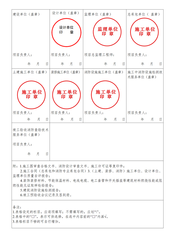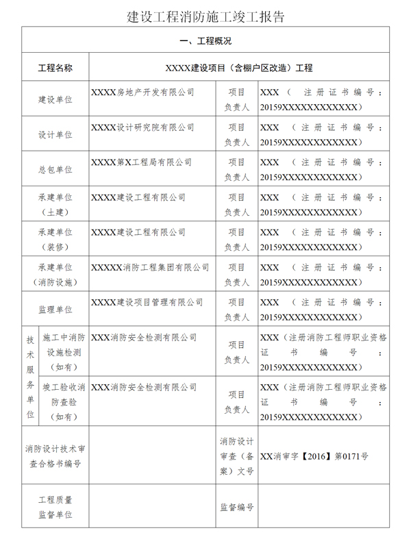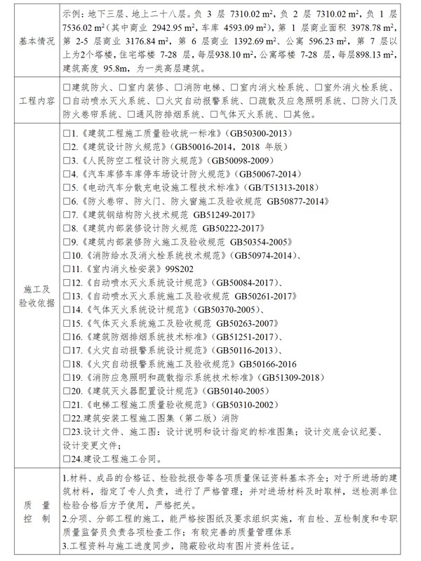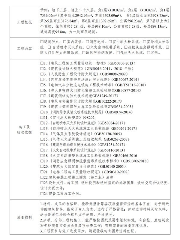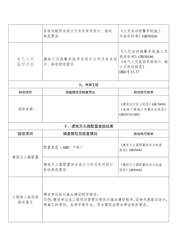 第十六條 建設(shè)單位編制工程竣工驗收報告前,應(yīng)開展竣工驗收消防查驗,查驗合格后方可編制工程竣工驗收報告。工程竣工驗收報告(模板參照附件二)內(nèi)容應(yīng)當(dāng)包括:工程報建日期,施工許可證號,消防設(shè)計審查意見,消防設(shè)計變更及審查情況(如該工程存在特殊消防設(shè)計則需提供專家評審意見)及竣工驗收消防查驗的情況等??⒐を炇障啦轵灥那闆r應(yīng)作為工程竣工驗收報告的附件,說明建設(shè)工程經(jīng)查驗符合下列要求:
