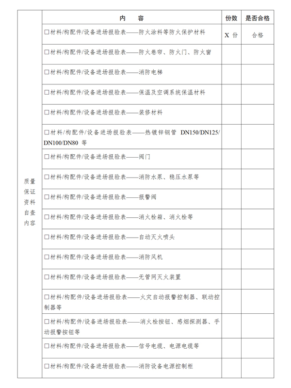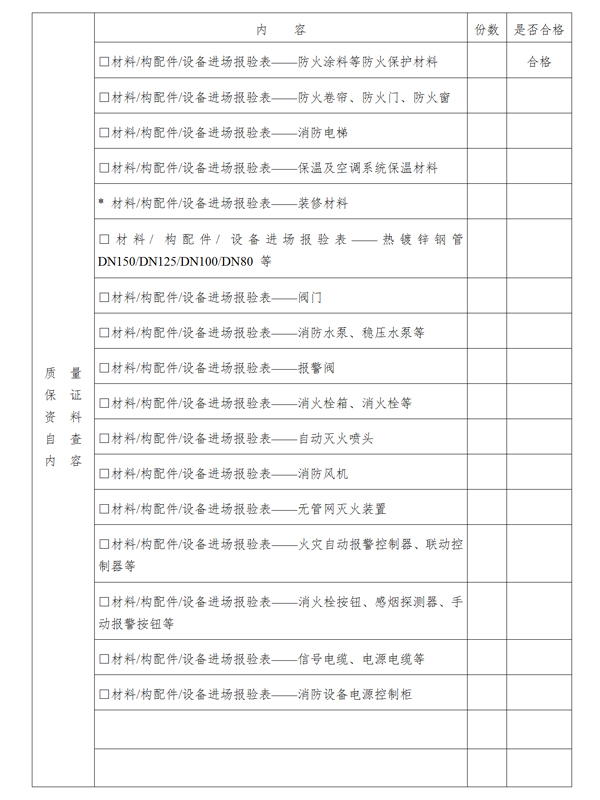 (二)有完整的工程技術(shù)檔案、施工和監(jiān)理管理資料,包括:涉及消防的各分部工程的進(jìn)場、隱蔽工程等施工過程資料、質(zhì)量驗收記錄和變更符合要求;防火間距、消防車道、消防救援場地和入口、建筑防爆、防火分區(qū)、防煙分區(qū)、安全疏散、消防電梯等檢查記錄;消防產(chǎn)品質(zhì)量合格證明,涉及消防的建筑(裝修)材料、建筑構(gòu)配件防火性能證明文件和設(shè)備的進(jìn)場試驗報告以及工程質(zhì)量檢測和功能性試驗資料等;