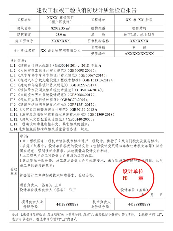 (六)設(shè)計單位對設(shè)計文件及施工過程中由設(shè)計單位簽署的設(shè)計變更通知書的實施情況進(jìn)行了檢查,并出具消防設(shè)計質(zhì)量檢查報告。消防設(shè)計質(zhì)量檢查報告應(yīng)經(jīng)項目設(shè)計負(fù)責(zé)人和設(shè)計單位技術(shù)負(fù)責(zé)人審核并簽字、加蓋執(zhí)業(yè)印章確認(rèn);