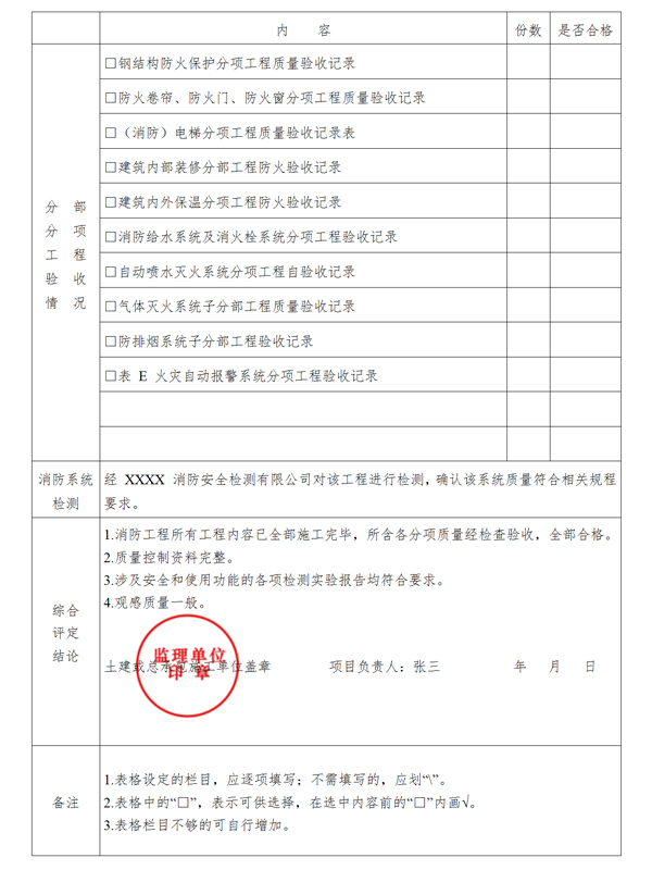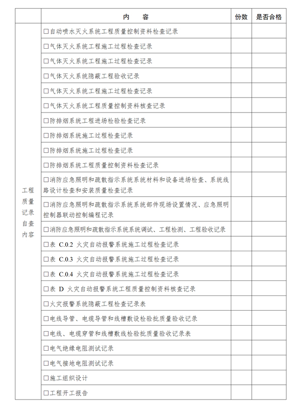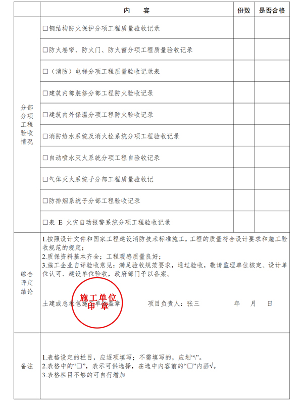 (四)施工單位在工程完工后對消防工程質(zhì)量進(jìn)行檢查,確認(rèn)工程質(zhì)量符合有關(guān)法律、法規(guī)和工程建設(shè)強(qiáng)制性標(biāo)準(zhǔn),符合設(shè)計文件和合同要求,消防工程各分部(分項)工程經(jīng)建設(shè)單位驗收全部合格,并出具消防工程竣工報告。工程竣工報告應(yīng)經(jīng)項目經(jīng)理和施工單位技術(shù)負(fù)責(zé)人審核并簽字、加蓋執(zhí)業(yè)印章確認(rèn);